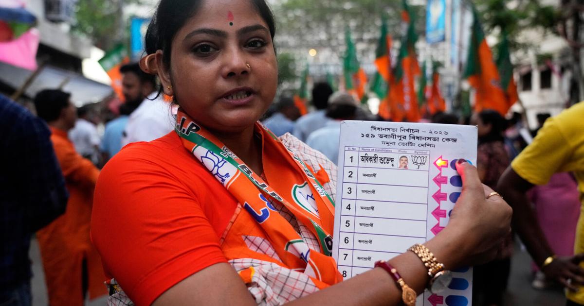 A supporter of Bharatiya Janata Party, BJP, demonstrates a sample voting machine with the name and picture of Suvendu Adhikari with party symbol during a rally ahead of the West