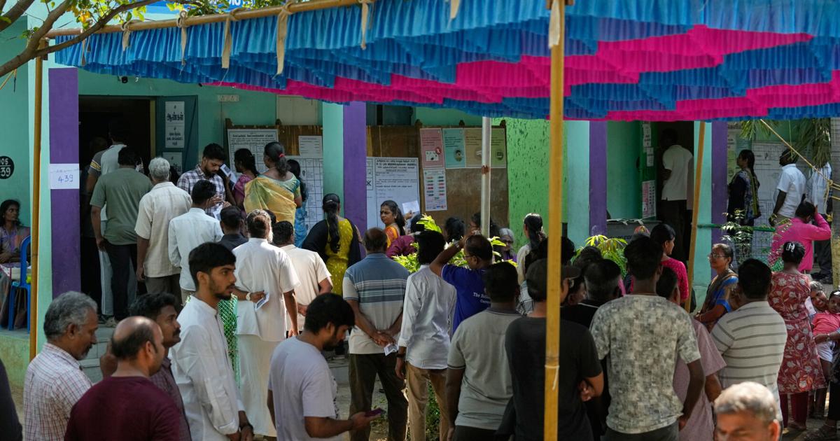 People wait to cast their vote at a polling station during the Tamil Nadu state assembly elections in Chennai, India, Thursday, April 23, 2026. (AP Photo/Mahesh Kumar A.)