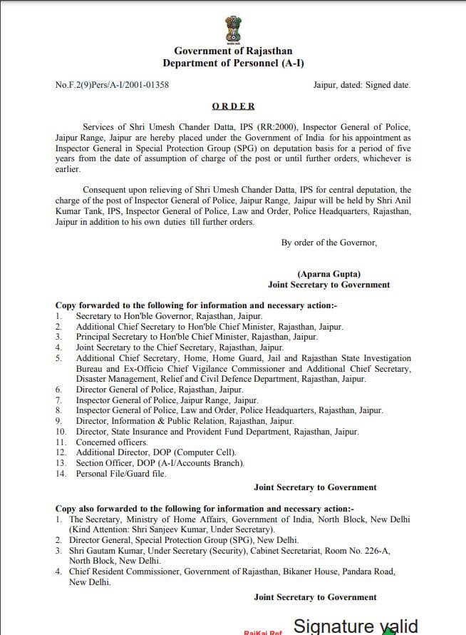 केंद्र सरकार ने जयपुर रेंज के आईजी आईपीएस उमेश चंद्र दत्ता को एसपीजी आईजी के पद पर प्रतिनियुक्ति दी है। इस संबंध में उनके आदेश का आधुनिक विभाग द्वारा जारी कर दिए गए हैं।
