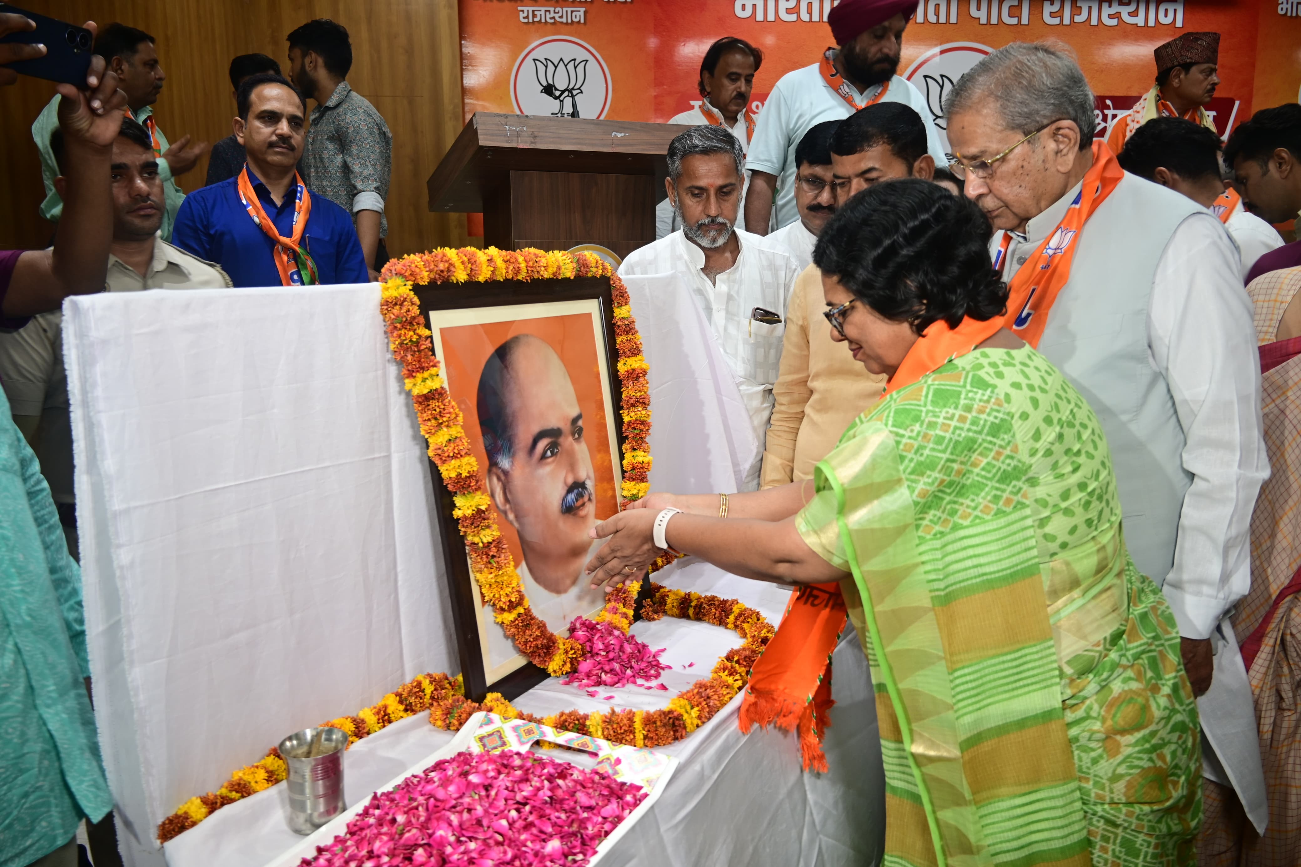 भाजपा प्रदेश कार्यालय में रविवार को जनसंघ के संस्थापक डॉ श्यामा प्रसाद मुखर्जी की पुण्यतिथि पर भाजपा प्रदेशाध्यक्ष सीपी जोशी, प्रदेश सह प्रभारी विजया राहटकर ने ‘‘स्मरण अभियान‘‘ की शुरुआत की। इस दौरान प्रदेशाध्यक्ष सीपी जोशी और प्रदेश सह प्रभारी विजया राहटकर ने ‘‘एक पेड़ माँ के नाम अभियान‘‘ की भी शुरुआत की। भाजपा प्रदेशाध्यक्ष जोशी ने कहा कि जनसंघ की स्थापना के बाद जब देश में संघ की तीन सीटें आई थी, उस दौर में 1 सीट राजस्थान से चित्तौडगढ़ की भी थी। ऐसे में राजस्थान ने भी उस दौर में जनसंघ का दीया जलाने में महत्वपूर्ण भूमिका निभाई थी। जनसंघ के संस्थापक डॉ मुखर्जी ने देश में पंडित नेहरू के परमिट व्यवस्था का भी विरोध किया था। इसी विरोध के स्वरूप उन्होंने राष्ट्र के लिए अपना बलिदान दे दिया, लेकिन उनके बलिदान को जनसंघ के बाद जनता पार्टी एवं फिर भारतीय जनता पार्टी ने समझा और आज कश्मीर भारत का अभिन्न अंग है। भाजपा डॉ मुखर्जी के बलिदान दिवस से लेकर उनकी जयंती तक प्रदेश के सभी शक्ति केंद्रों पर ‘‘एक पेड़ मां के नाम‘‘ अभियान के तहत 370 पेड़ लगाएगी। इस अभियान का आगाज भाजपा प्रदेश कार्यालय से किया गया। भाजपा इस अभियान में प्रदेश के सभी सामाजिक और गैर सामाजिक संगठनों से भी वृक्षारोपण करने की अपील करती है।