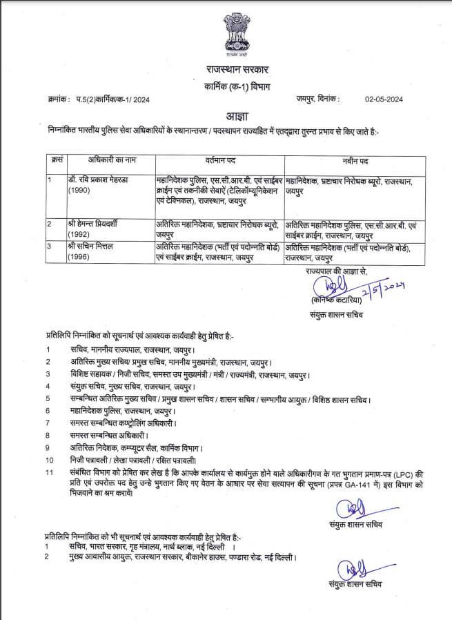 मुख्यमंत्री भजनलाल शर्मा के निर्देश पर कार्मिक विभाग ने पुलिस के तीन वरिष्ठ आईएएस अधिकारियों के तबादले किए हैं।