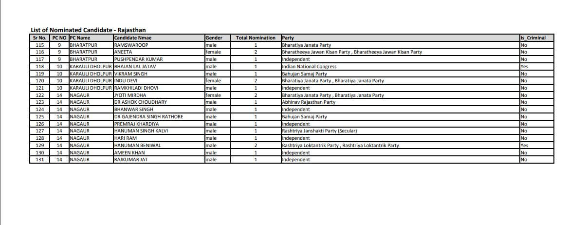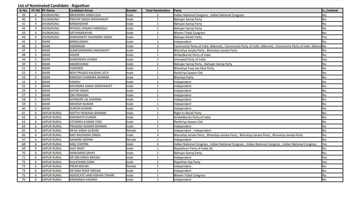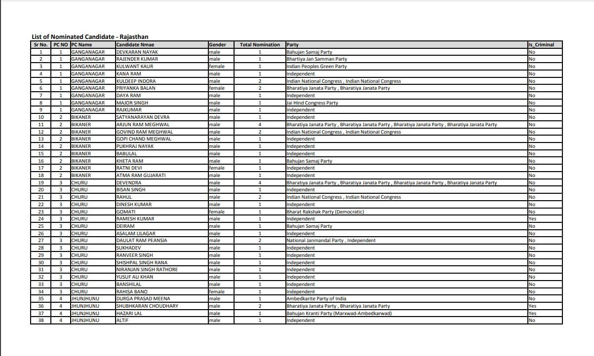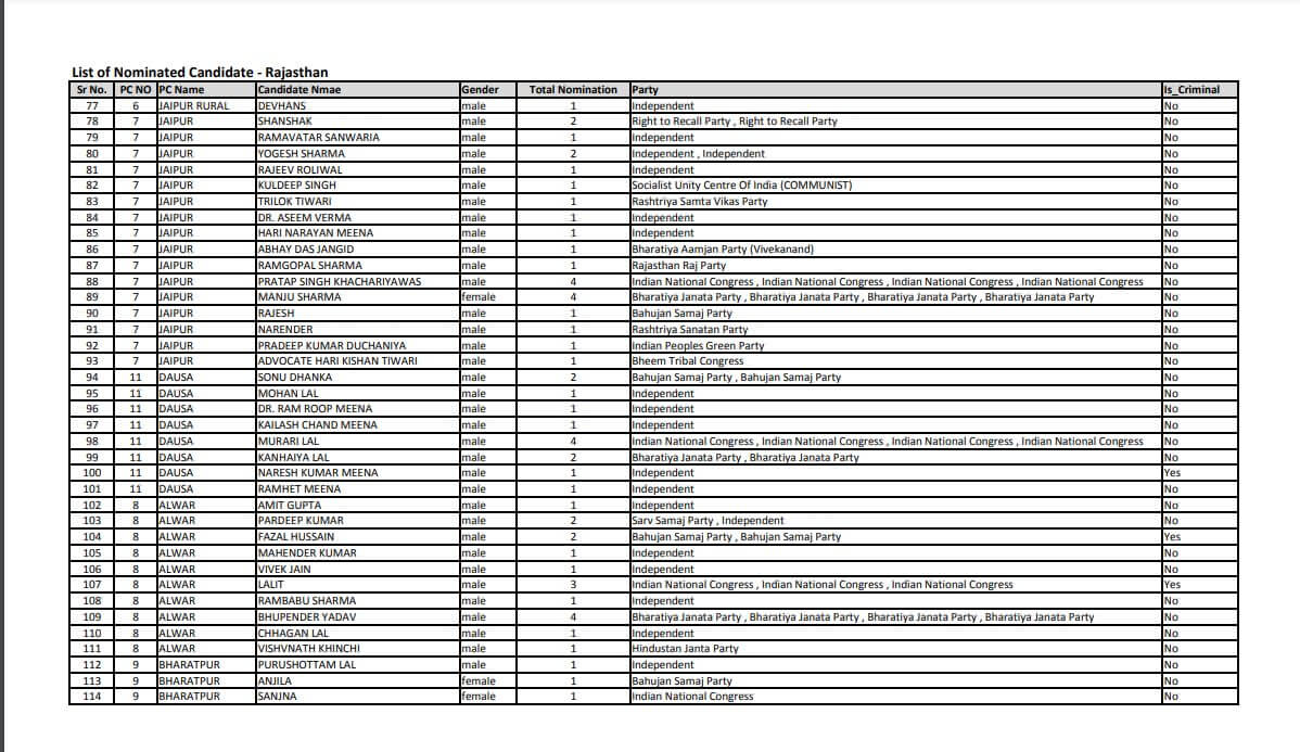 कुल प्रत्याशी, (कुल नामांकन)गंगानगर: 9 (11),बीकानेर: 9 (13),चूरू: 16 (21),झुंझुनू : 10 (12),सीकर : 16 (20),जयपुर ग्रामीण : 17 (24),जयपुर: 16 (24),अलवर : 10 (17),भरतपुर: 6 (7)करौली- धौलपुर: 4 (5),दौसा : 8 (13)नागौर: 10 (12)