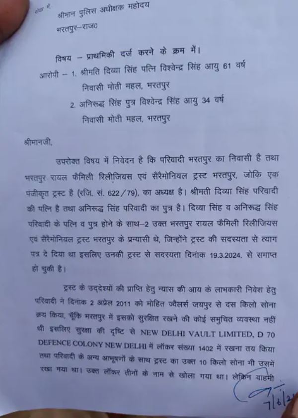 विश्वेंद्र ने रिपोर्ट में लिखा है कि दिव्या और अनिरुद्ध ने भरतपुर रॉयल फैमिली रिलीजियस और सेरेमोनियल ट्रस्ट की सदस्यता से त्यागपत्र दे दिया था। इसलिए उनकी ट्रस्ट से सदस्यता 19 मार्च 2024 में खत्म हो चुकी है। मैंने 2 अप्रैल 2011 को मोहित ज्वेलर्स जयपुर से 10 किलो सोना खरीदा था। इसे भरतपुर में सुरक्षित रखने की जगह नहीं थी। इसलिए दिल्ली के लॉकर में रखा था। यह लॉकर मेरे, दिव्या और अनिरुद्ध तीनों के नाम पर खोला था।