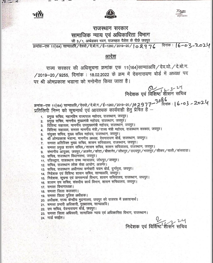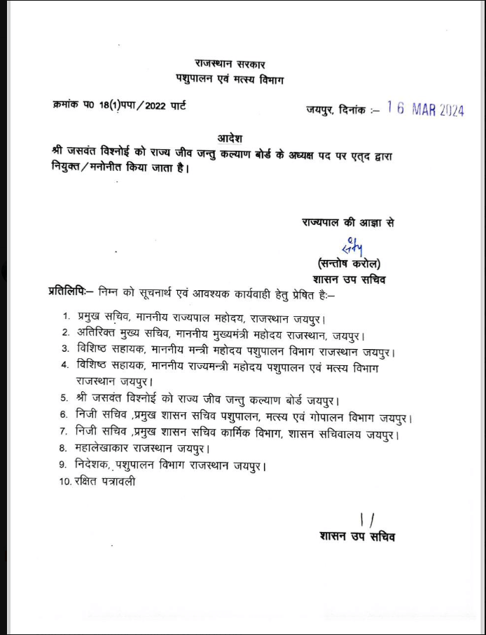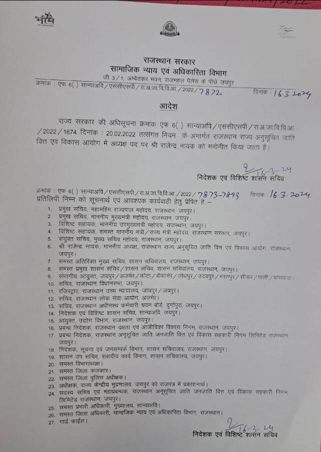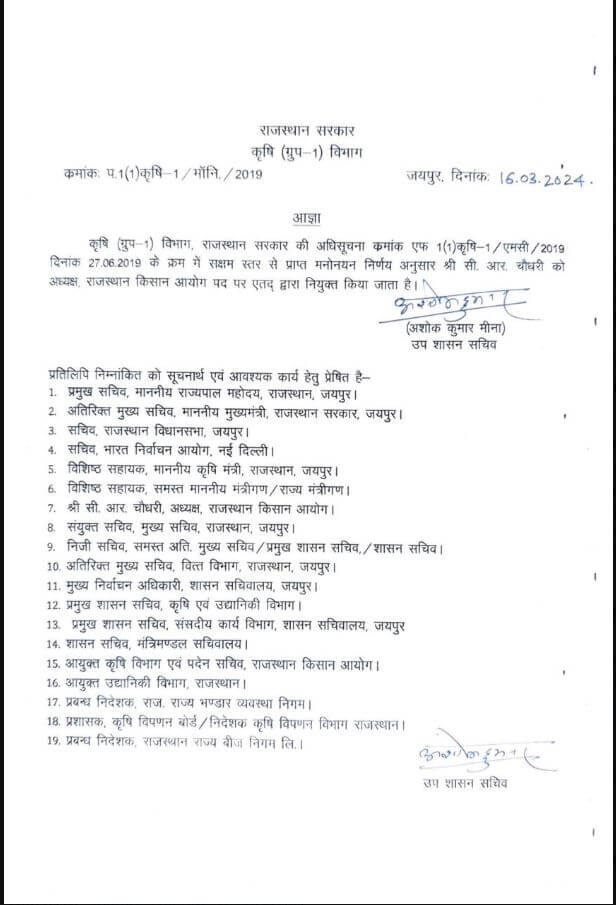 आचार संहिता लगने से पहले पूर्व केंद्रीय मंत्री  सीआर चौधरी को किस आयोग का अध्यक्ष,पूर्व सांसद जसवंत विश्नोई को राज्य जीव जंतु कल्याण बोर्ड का अध्यक्ष,ओम प्रकाश भडाणा को देवनारायण बोर्ड का अध्यक्ष और राजेंद्र नायक को राज अनुसूचितजाति वित्त एवं विकास आयोग का अध्यक्ष नियुक्त किया है।