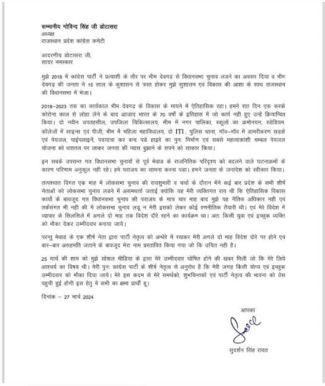 राजसमंद से कांग्रेस के घोषित उम्मीदवार सुदर्शन सिंह रावत ने चुनाव लड़ने से किया इनकार, कांग्रेस प्रदेश अध्यक्ष डोटासरा को लिखा पत्र