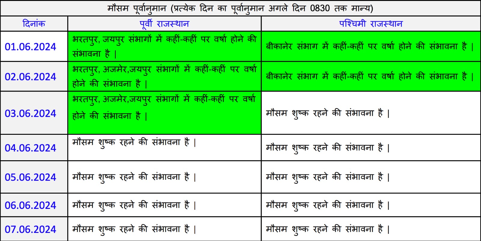 प्रदेश में पश्चिमी विक्षोभ के प्रभाव से आगामी 48 घंटों के दौरान बीकानेर, जयपुर, भरतपुर व कोटा संभाग के कुछ भागों में आंशिक बादल छाए रहने व दोपहर बाद मेघगर्जन के साथ 40-50 Kmph की रफ्तार से तेज हवाएं व हल्की – मध्यम बारिश होने की संभावना है।