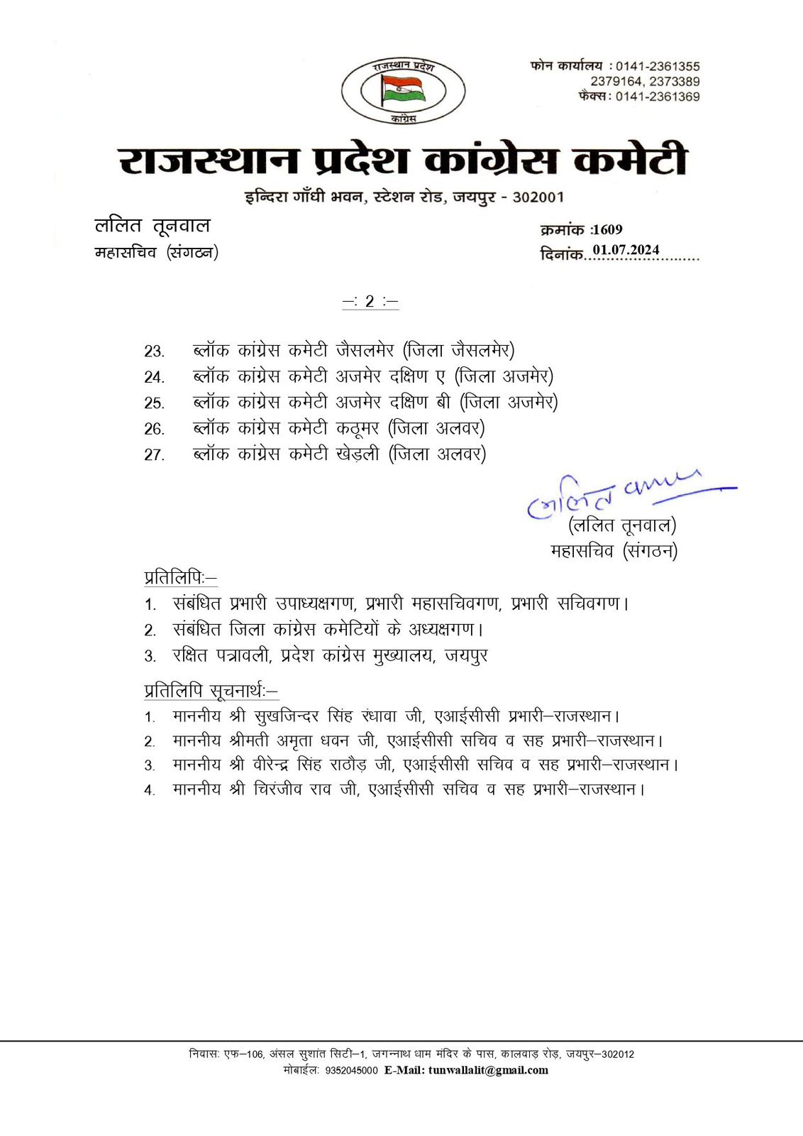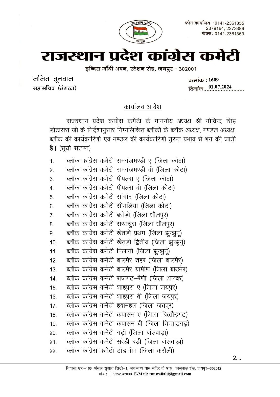 लोकसभा चुनाव में कांग्रेस पार्टी के खिलाफ काम करने वाले नेताओं के खिलाफ की करवाई, डोटासरा ने 17 ब्लॉक अध्यक्ष और कार्यकारिणी को किया भंग