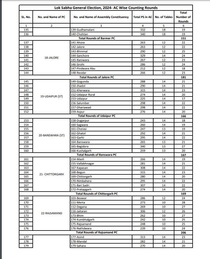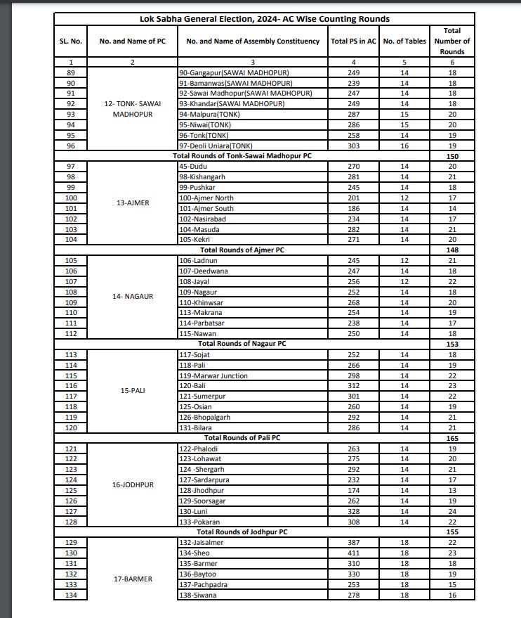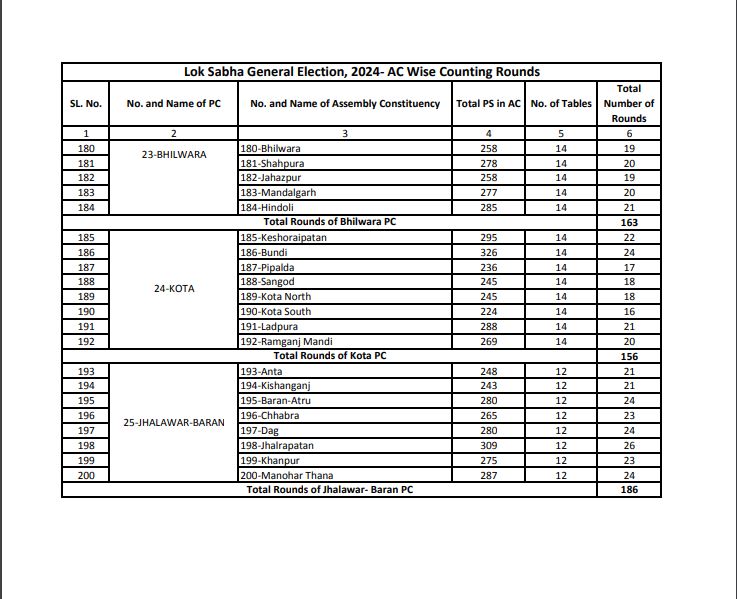 मुख्य निर्वाचन अधिकारी गुप्ता ने बताया कि मतों की गिनती की प्रक्रिया और मतगणना केंद्र की व्यवस्था के बारे में सभी लोकसभा निर्वाचन क्षेत्रों में राजनैतिक दलों के प्रतिनिधियों के साथ भी बैठक कर ली गई है। राजनैतिक दलों से अपने-अपने काउंटिंग एजेंट्स की सूचियां 31 मई तक संबंधित रिटर्निंग ऑफिसर कार्यालय में आवश्यक रूप से देने को कहा गया है, जिनमें से अधिकतर ने सूची आरओ को सौंप दी है। जिन्हें अधिकृत पास जारी किया जाना प्रक्रियागत है। साथ ही राजनैतिक दलों एवं अभ्यर्थियों को मतगणना संबंधित संपूर्ण जानकारी प्रदान की जा चुकी है। मतगणना उपरांत विजय जूलूस नहीं निकाले जाने, मतगणना स्थल को ईको-फ्रेंडली रखने एवं धारा-144 की पालना सुनिश्चित करने के बारे में भी विस्तार से बताया जा चुका है।