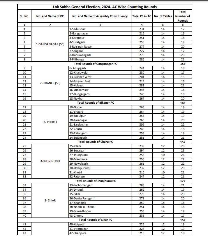 मुख्य निर्वाचन अधिकारी गुप्ता ने बताया की भारत सेवा मतदाता निर्वाचन आयोग के इलेक्ट्रॉनिकली ट्रांसमिटेड पोस्टल बैलेट मैनेजमेंट सिस्टम (इटीपीबीएमएस) के द्वारा मतदान कर रहे हैं। अब तक 72 हजार 419 मत प्राप्त हो गए हैं। 4 जून को प्रातः 8 बजे से पहले संबंधित आरओ को प्राप्त होने वाले ईटीबीपी को मतगणना में शामिल किया जा सकेगा। ईटीपीबीएमएस की प्री-काउंटिंग के लिए 35 कक्ष बनाए गए हैं और 469 टेबल्स लगाई जाएंगी। झुंझुनूं लोकसभा क्षेत्र के लिए सर्वाधिक 84, अलवर के लिए 56, सीकर के लिए 53 और जयपुर ग्रामीण लोकसभा क्षेत्र के लिए 48 टेबल्स लगाई जाएंगी।