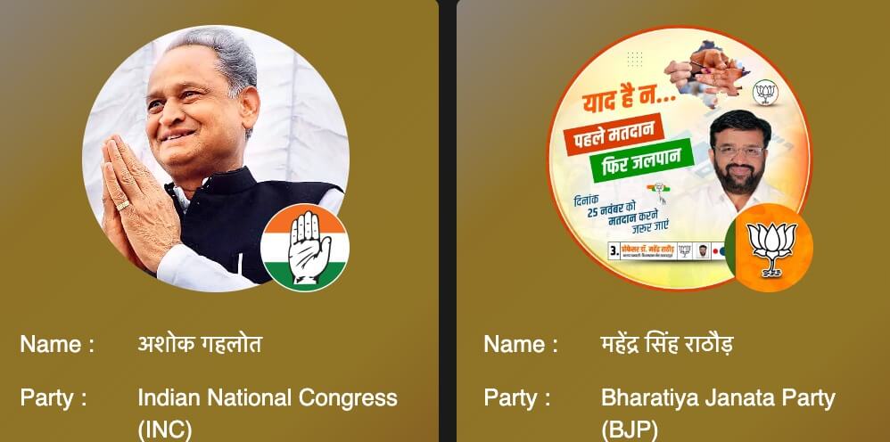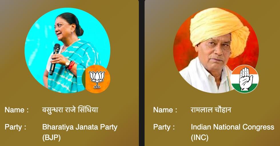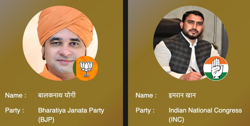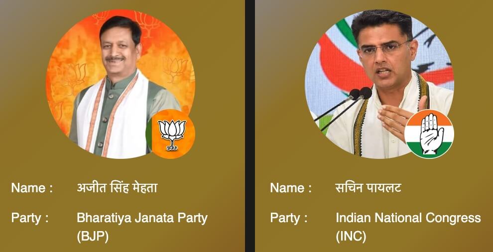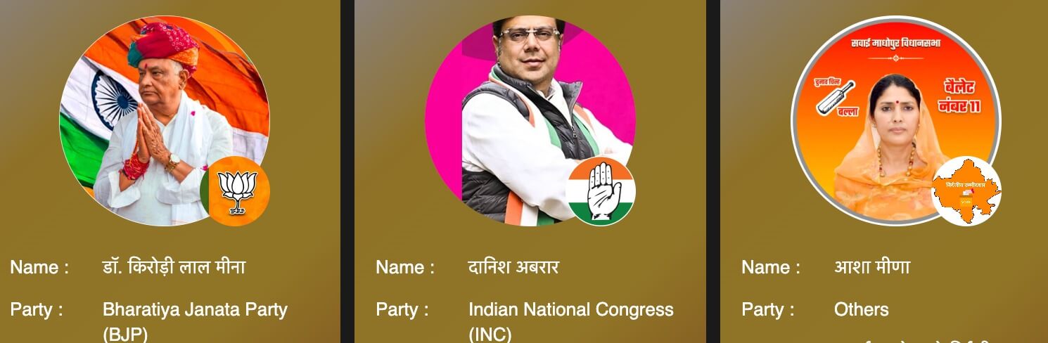 तिजारा की बात करें तो कांग्रेस के इमरान खान ने अलवर के सांसद बालक नाथ को कड़ी चुनौती दे रखी है। सवाई माधोपुर में भाजपा की बागी आशा मीणा चुनाव जीत सकती है। राज्यसभा के सदस्य डॉ. किरोड़ी लाल मीणा को भाजपा की बागी आशा मीणा ने और कांग्रेस के दानिश अबरार को उनके बागी डॉक्टर अजीज आजाद ने चुनाव हारने की तैयारी कर रखी है। नाथद्वारा में विधानसभा अध्यक्ष डॉ. सीपी जोशी को उदयपुर राजघराने के सदस्य विश्वराज सिंह चुनाव हरा सकते हैं।