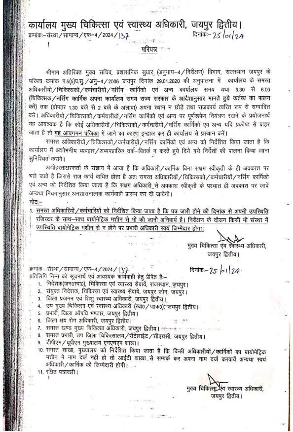 अस्पताल में काम करने वालेनर्सिंग स्टाफ और डॉक्टर को दोपहर में केवल 30 मिनिट का लंच देने का प्रावधान किया गया है। यह व्यवस्थाएं जयपुर के चिकित्सा विभाग केजारी आदेश के बाद लागू कर दी गई है।