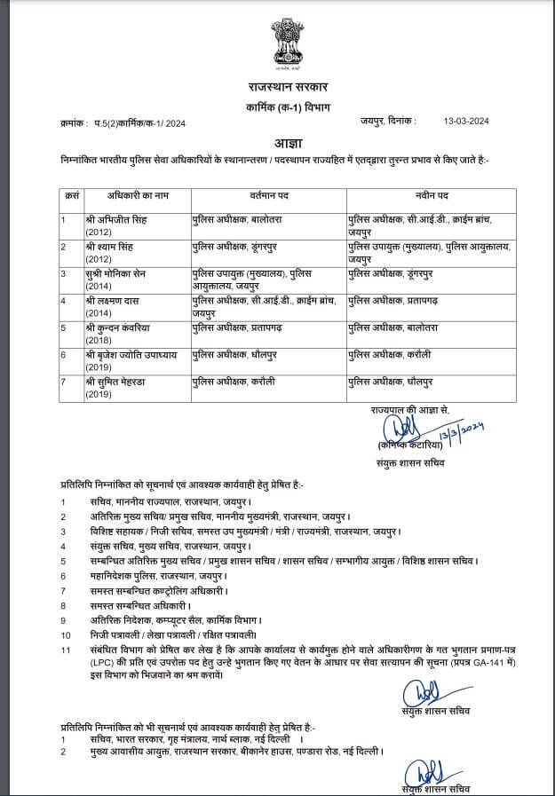 मुख्यमंत्री भजनलाल शर्मा के निर्देश पर कार्मिक विभाग ने 7 आईपीएस अधिकारियों के तबादले किए हैं। इन तबादलों में पांच जिले डूंगरपुर,प्रतापगढ़,बालोतरा,करौली और धौलपुर के पुलिस अधीक्षक बदले गए हैं।