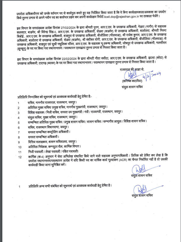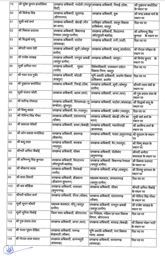 मुख्यमंत्री भजनलाल शर्मा के निर्देश पर कार्मिक विभाग ने 106 राजस्थान प्रशासनिक सेवा (आरएएस) के अधिकारियों के तबादले किए हैं।