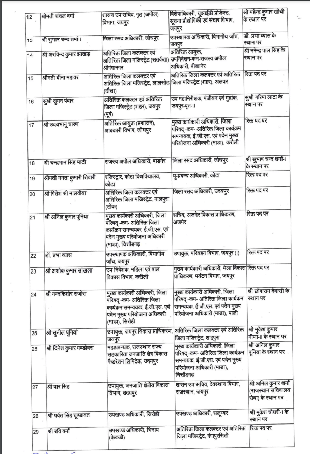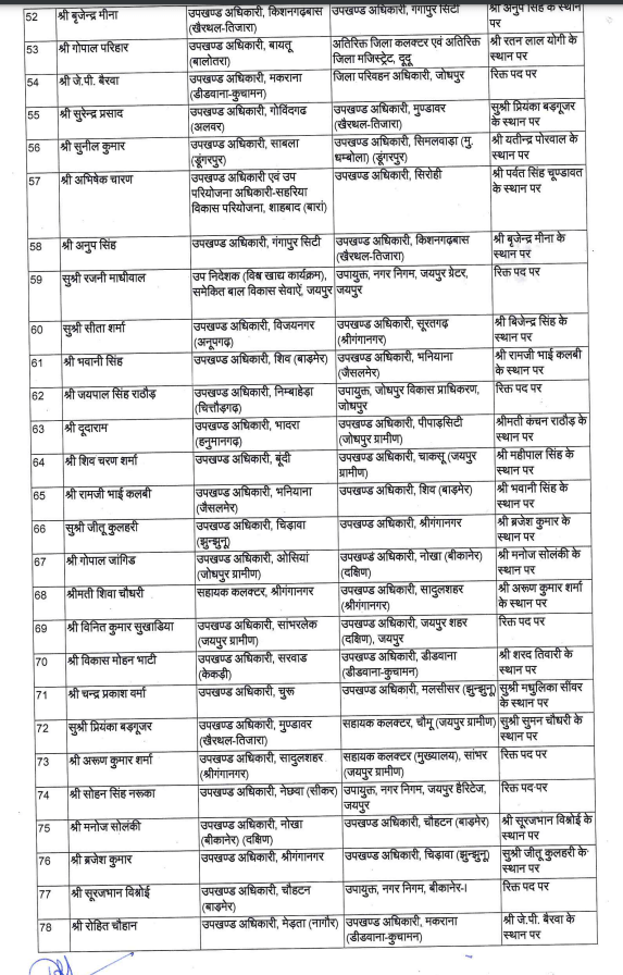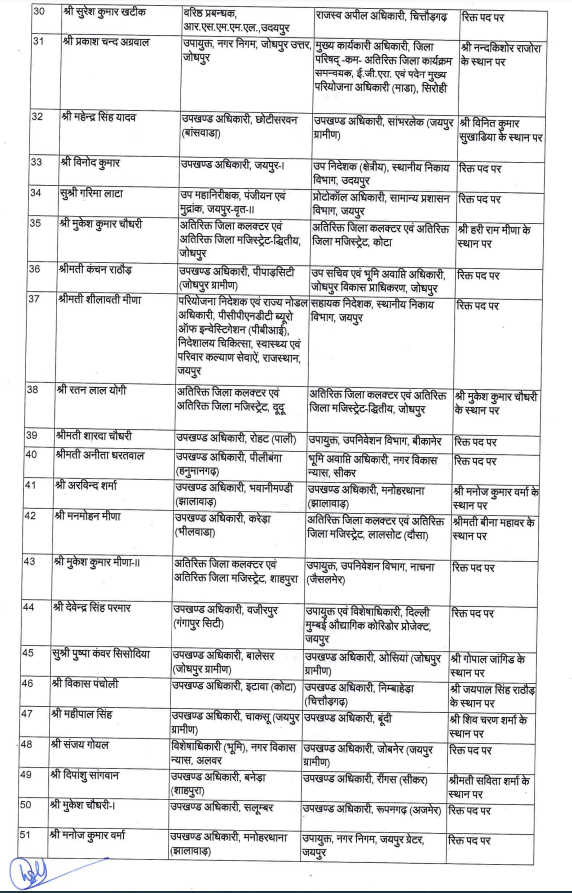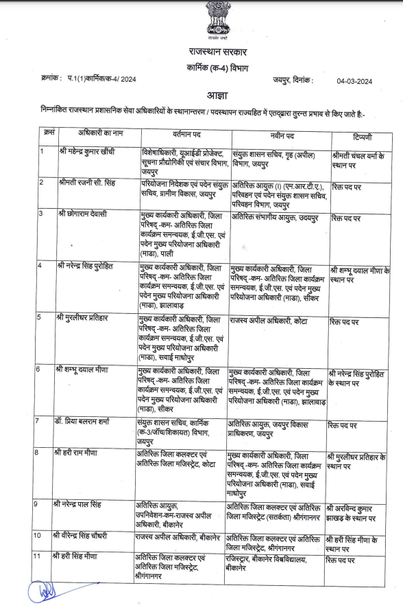 लोकसभा चुनाव को देखते हुए मुख्यमंत्री शर्मा ने विधायकोंऔर मंत्रियों की सिफारिश पर यह व्यापक बदलाव किया है।कार्मिक विभाग के संयुक्त शासन सचिव कनिष्क कटारिया ने यह आदेश जारी किए हैं। विस्तार से देखे नाम सूची में…..
