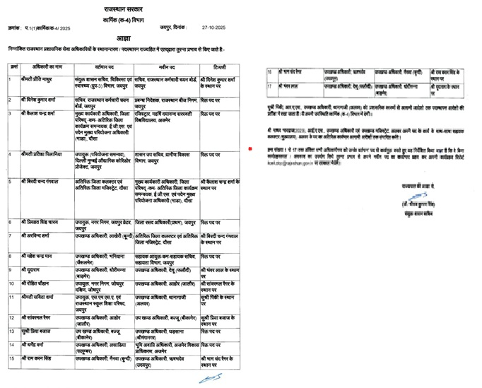 राजस्थान में बड़ा प्रशासनिक फेरबदल, 17 RAS अधिकारियों के तबादले; देखें लिस्ट