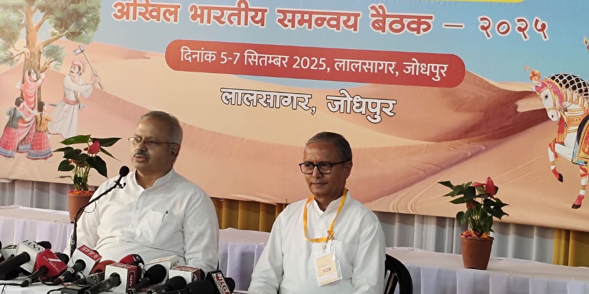जोधपुर में राष्ट्रीय स्वयंसेवक संघ (RSS) की तीन दिवसीय अखिल भारतीय समन्वय बैठक रविवार (07 सितंबर, 2025) को सम्पन्न हुई। अंतिम दिन आयोजित पत्रकार वार्ता में संघ के राष्ट्रीय प्रचार प्रमुख सुनील आम्बेकर ने बैठक में हुई चर्चाओं का सार साझा किया। उन्होंने बताया कि बैठक में देशभर से आए विभिन्न संगठनों के कार्यकर्ताओं, राष्ट्रीय अध्यक्षों और पदाधिकारियों ने क्षेत्रीय समस्याओं, अनुभवों और योजनाओं को साझा किया।